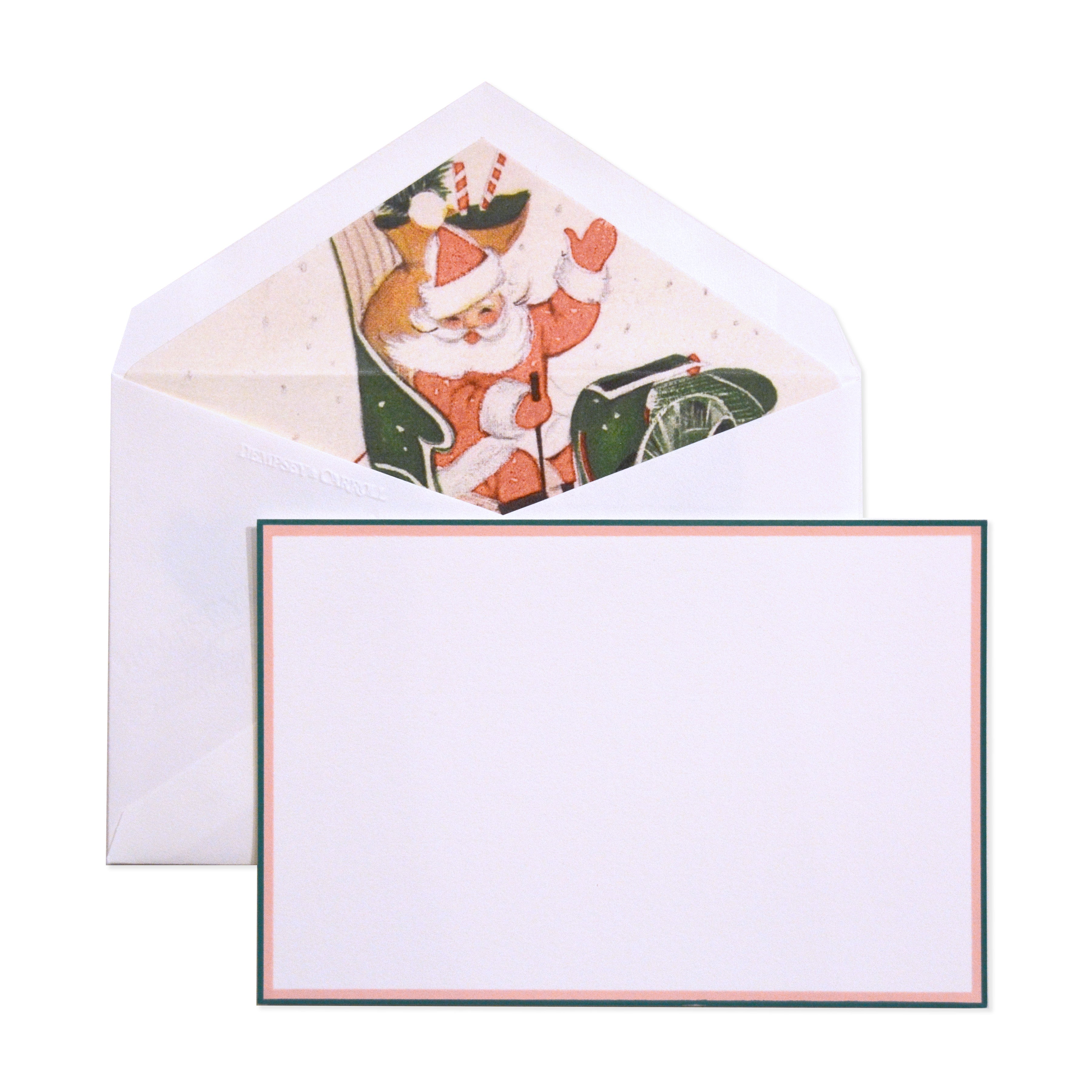 Santa Claus is coming to town! Inspired by the vintage holiday cards of the 1940s and 50s, these white #3 envelopes are lined with a fun, whimsical illustration of Santa, decked out in pink and flying his self-propelled sleigh. Matching cards are hand painted with a double border in Pink and Green.