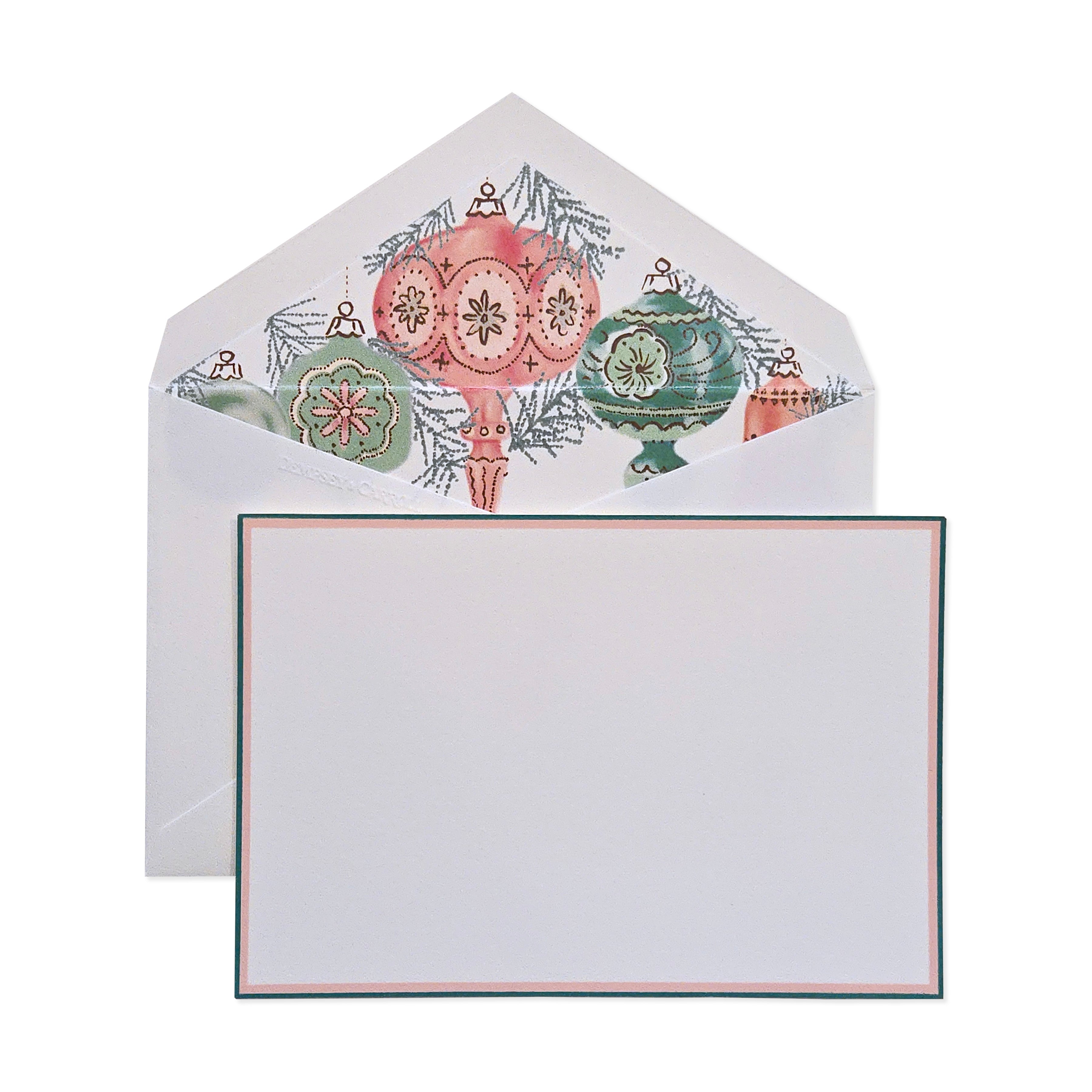 Inspired by the vintage holiday cards of the 1940s and 50s, these white #3 envelopes are lined with five colorful vintage ornaments, each with a hand-drawn design, and surrounded by tinsel and glitter. Matching cards are hand painted with a double border in Pink and Green.