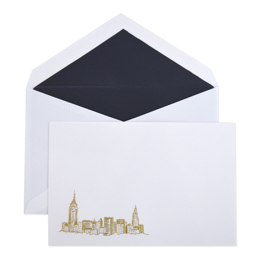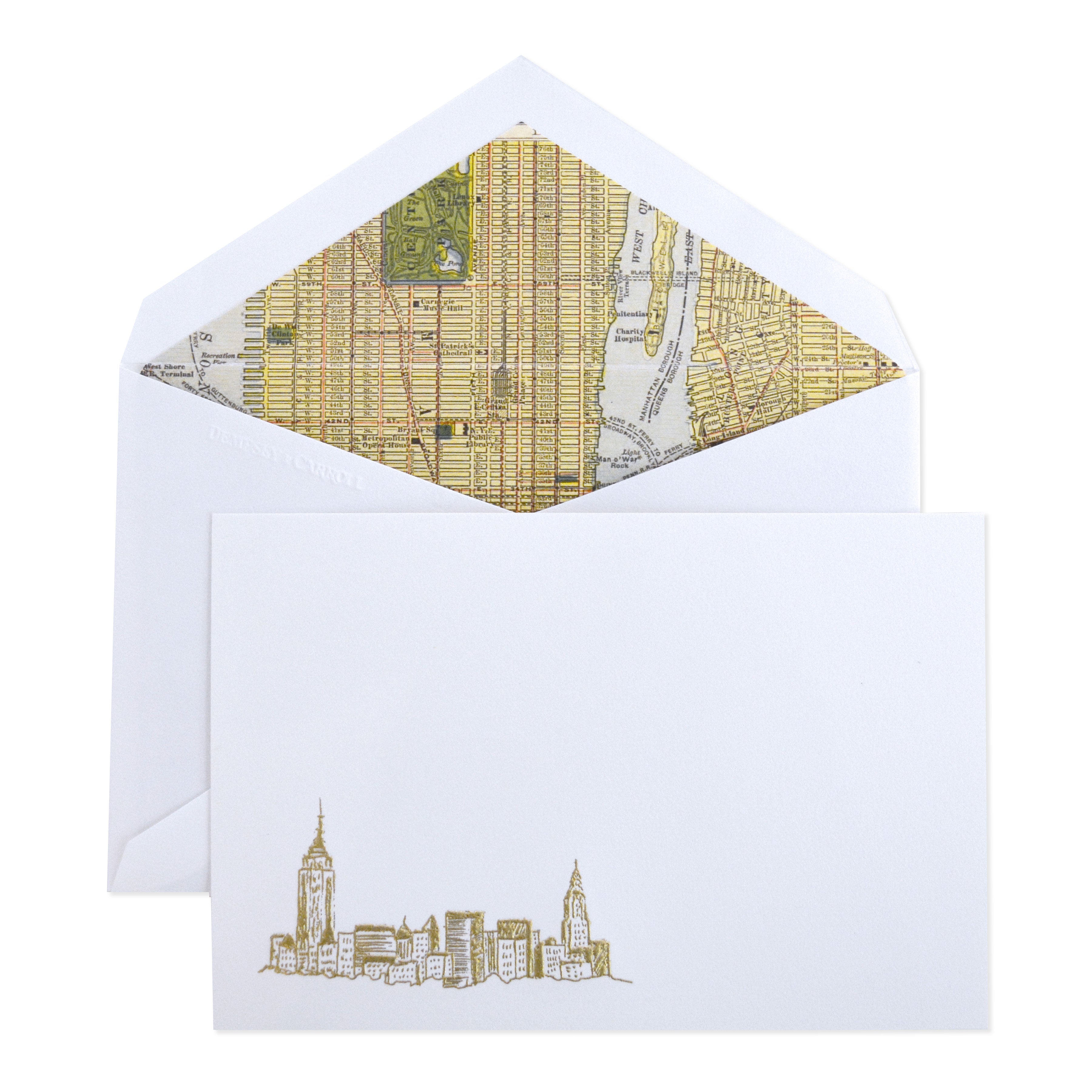 Engraved cards and hand-lined envelopesThe most famous skyline in the world (New York City, of course) shines on our white #3 (6-3/8" x 4-1/4") correspondence cards, engraved along the bottom in shimmering gold ink. The matching white envelopes are hand lined in your choice of Regent matte liner or a vintage NYC map print.