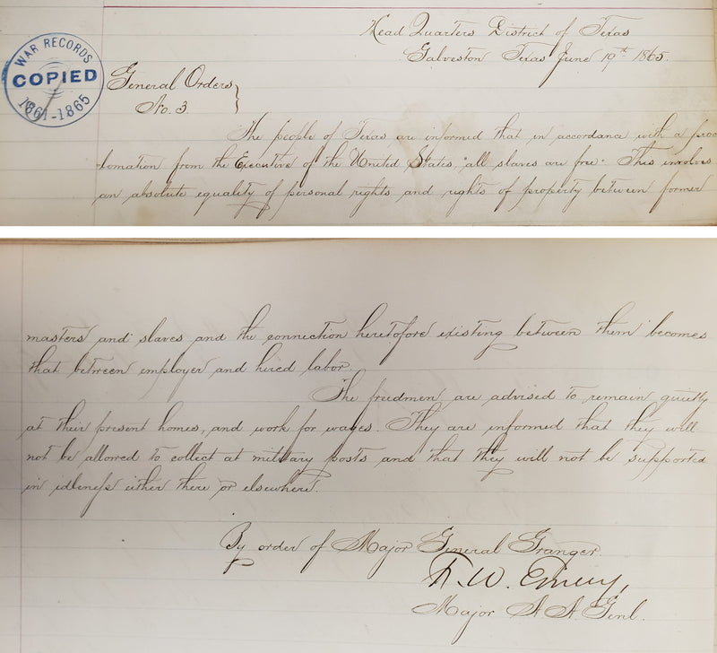 On June 19, 1865 Union officer Maj. Gen. Gordon Granger read aloud General Order No. 3 in Galveston, Texas. This date, which has become known as Juneteenth, informed Texas that all those enslaved in the state were free.
